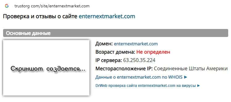 Проверка веб-портала шулеров Энтер Некст Маркет на trustorg com показала, что возраст домена определить невозможно, мы имеем дело с очередной мошеннической организацией.