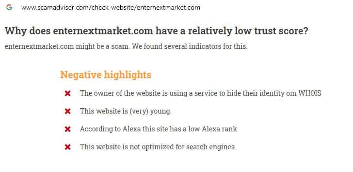 Проверка EnterNextMarket на сайте скамадвайсер ком показала, что у сайта данной конторы низкий рейтинг, а также выявлено множество отрицательных моментов в работе сервера.