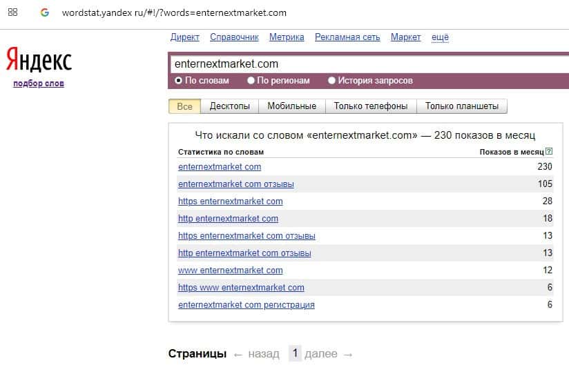 Количество запросов по бренду название домена компании "enternextmarket.com" на Вордстарт Яндекс Ру составляет 230 показов за месяц.