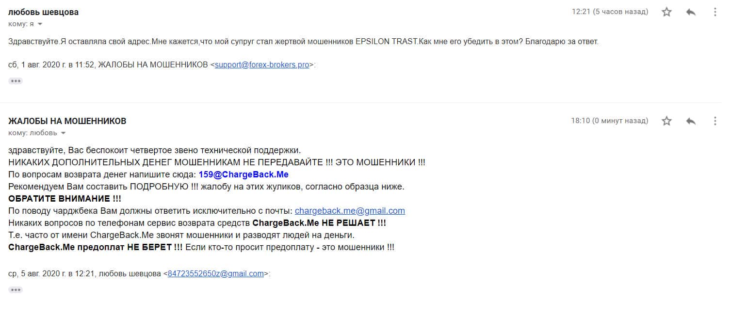 Ниже представлено письмо, где прикреплена развернутая жалоба о мошеннической деятельности шулерской организации EpsilonTrusts.