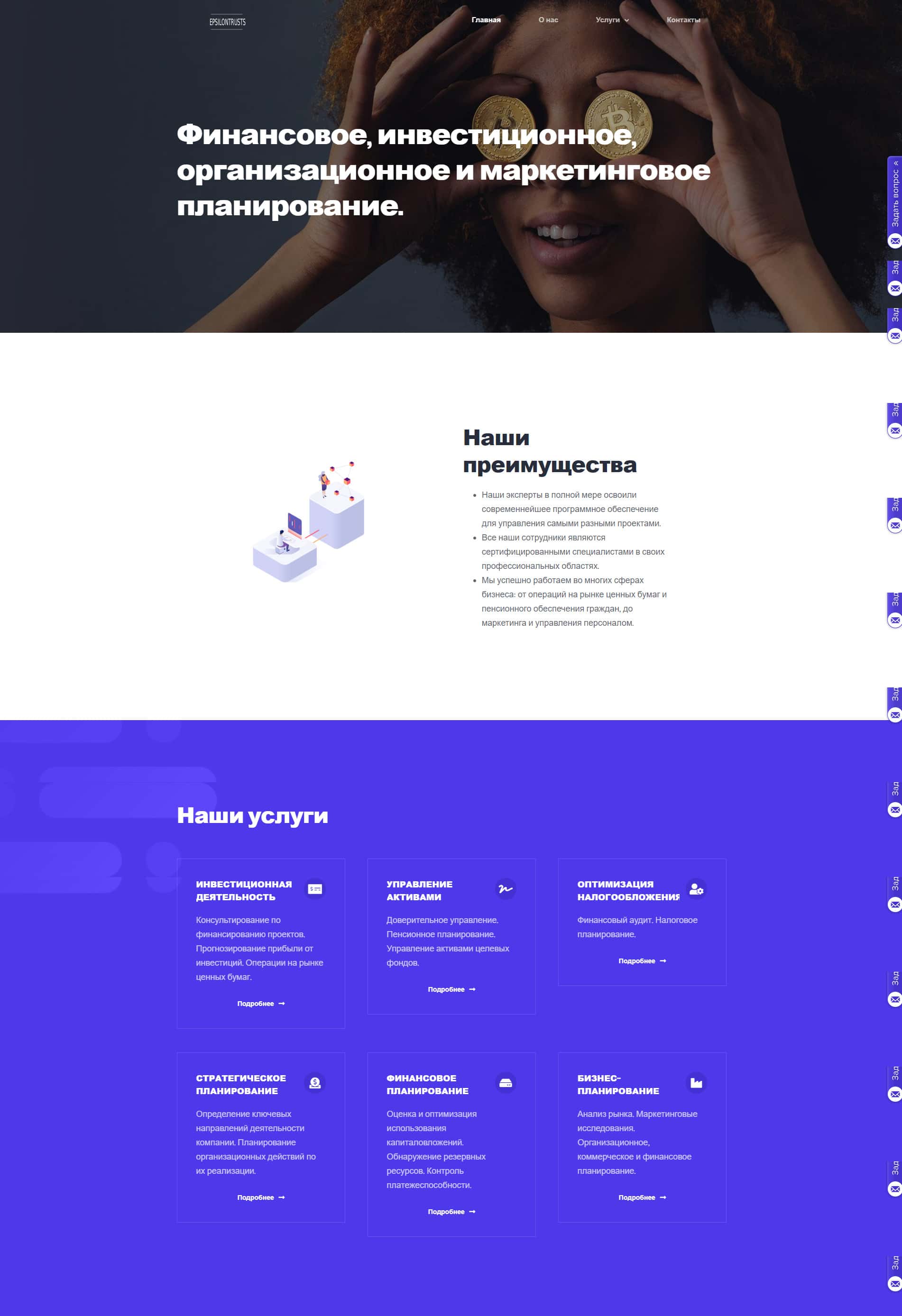 В своей публикации на главной странице сайта, контора EpsilonTrusts разместила несколько пунктов, почему именно выбирают работу с ними. Конечно же это все вранье и нет никакого практического применения в услугах, которые они предлагают, тем более, что все это наоборот приводит клиентов к финансовому краху.