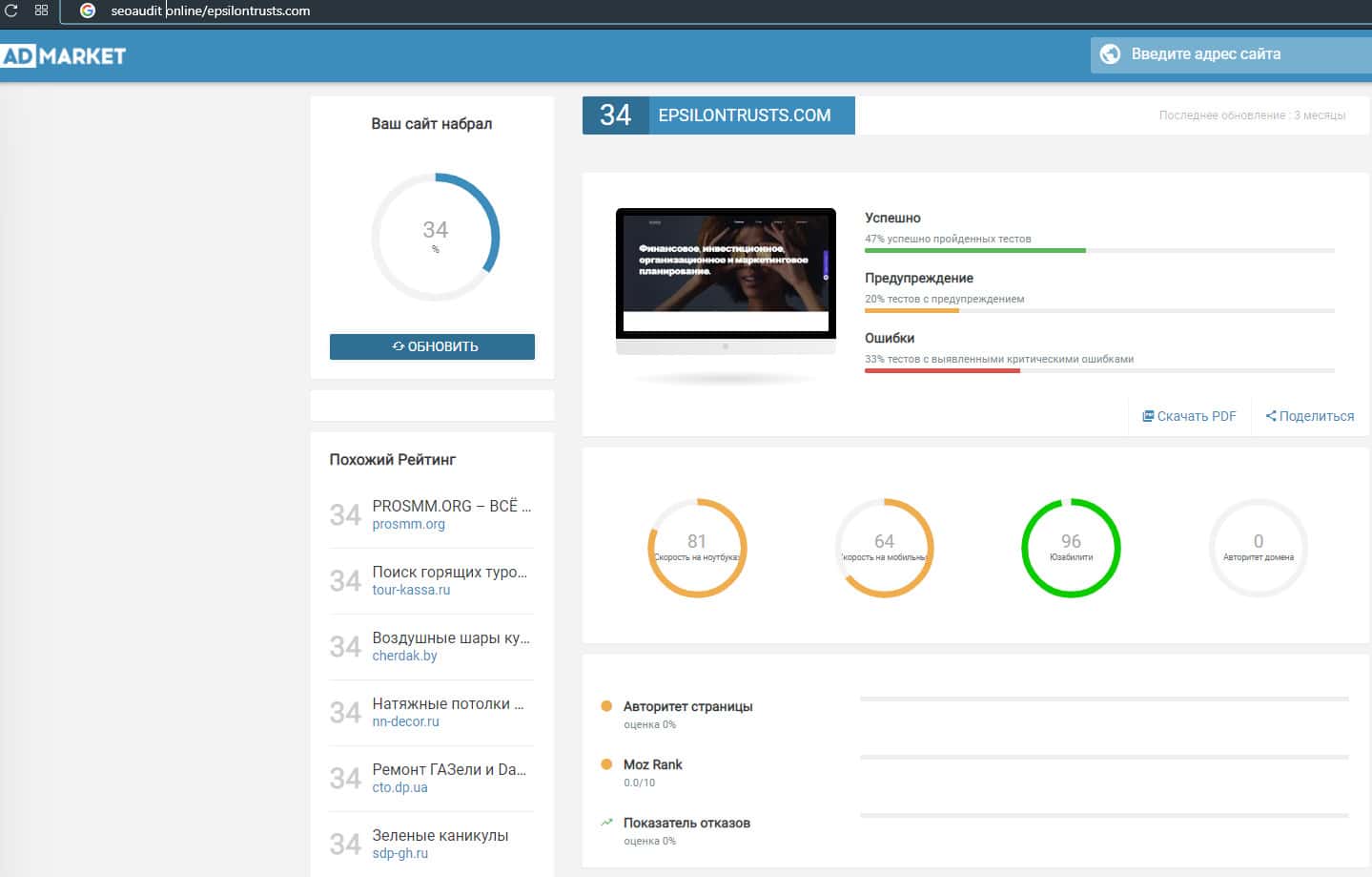 Из следующей публикации мы можем увидеть, как мошенническая организация EpsilonTrusts не смогла сделать нормальный сайт. Один из ресурсов с автоматической проверкой указал, что сайт состоит из 20% предупреждений и 33% реальными ошибками. Сразу видно, что их ресурс делали какие-то непрофессионалы.