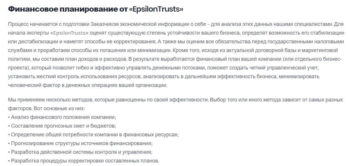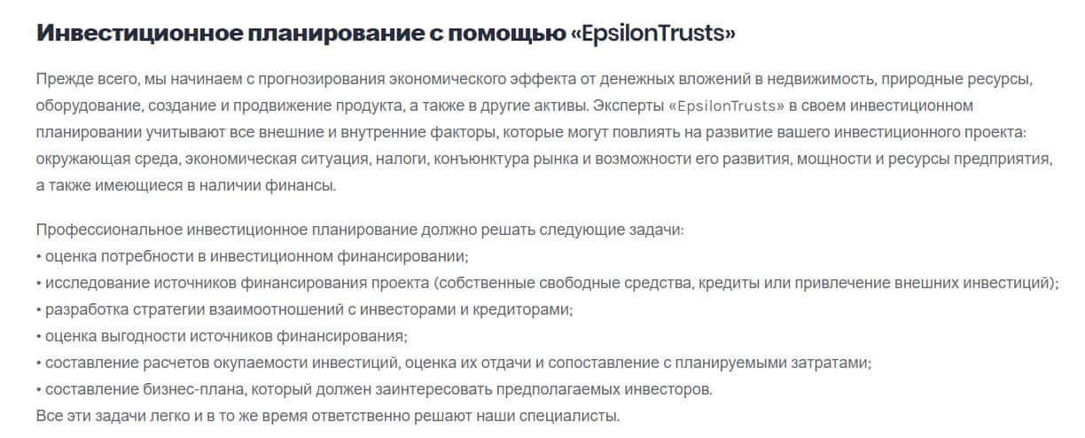 Контора EpsilonTrusts очень хорошо лечит касательно инвестиционном планировании, якобы благодаря этому они также достигли высоких результатов. Весь текст слизан с различных других источников, и нет даже реального документального подтверждения, что используя свои схему планирования, они хоть что-то смогли сделать.