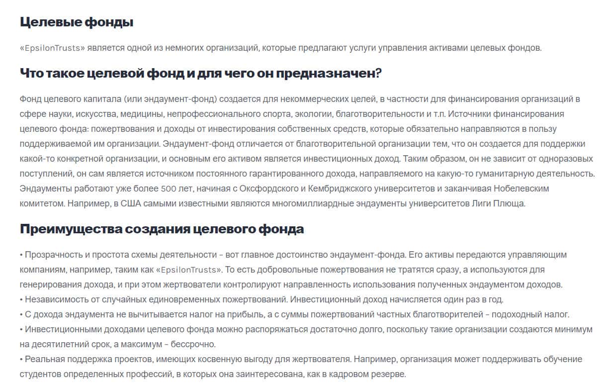 Контора EpsilonTrusts всеми силами пытается выманить деньги у клиентов и готовы даже обманывать с помощью предложения о целевых фондов. Лохотрон преимущественно создает целевой фонд для сбора денег с людей, которые заинтересованы в этом, а потом как обычно соскамятся и сбегут с деньгами клиентов.