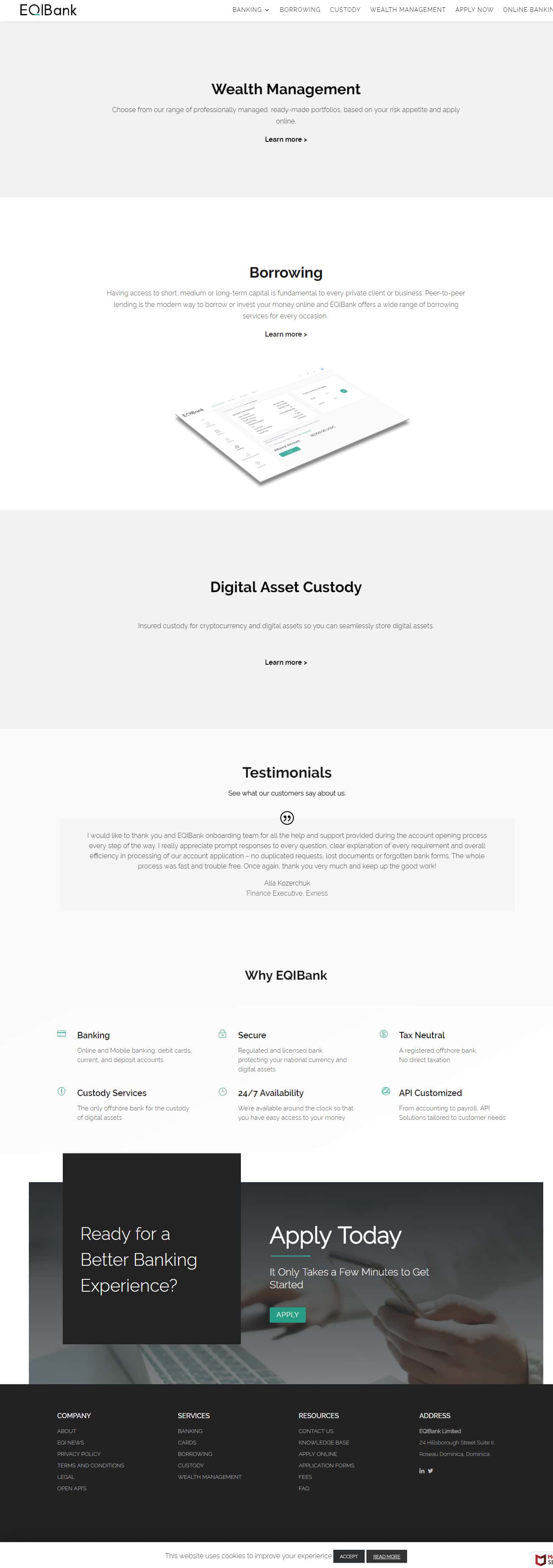 Истинную суть конторы Экюи Банк можно увидеть, просто взглянув на её веб-сайт. Сделан по той же схеме, что и сотни предшественников. Куча информации, в основном состоящей из обещаний и заверений, не имеющих ничего общего с реальностью. Реальность же такова – EqiBank не достоин вашего доверия, как и все оффшор-конторы.