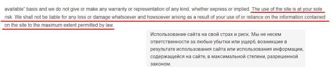 Согласитесь, онлайн-банк с отличной репутацией мог бы запарится и прикрепить на сайт скан лицензии. У EqiBank же такого нет. Очень странно для уважаемого финансового института, но для онлайн-мошенника, скрывающегося от правосудия – в самый раз. Помимо лицензии, тревожным звоночком является договор, где аферюги снимают с себя всю ответственность.