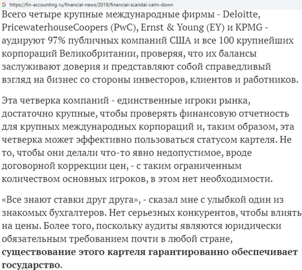 Став монополистами, большая четверка фиктивных аудиторов взяла на себя роль судей, карателей и рэкетиров. Крупные лохотроны отстегивают аудиторам-гангстерам Эрнст энд Янг крупные суммы, чтобы оставаться в безопасности и безнаказанно обворовывать трейдеров и инвесторов - иначе можно нарваться на их проверку и придется платить больше.
