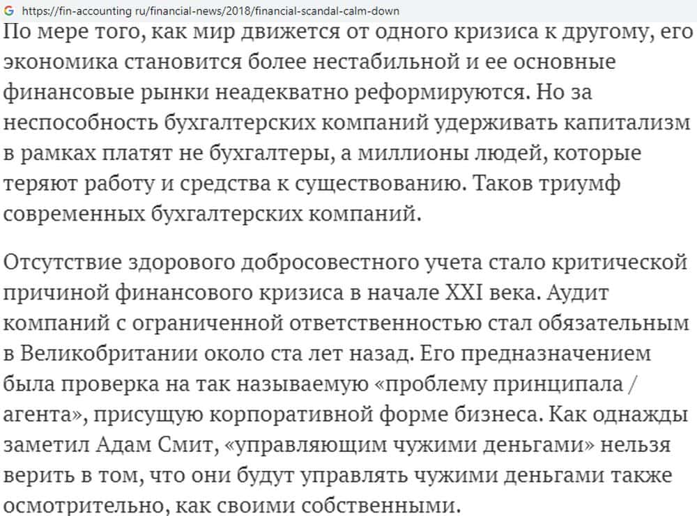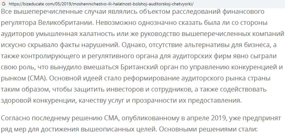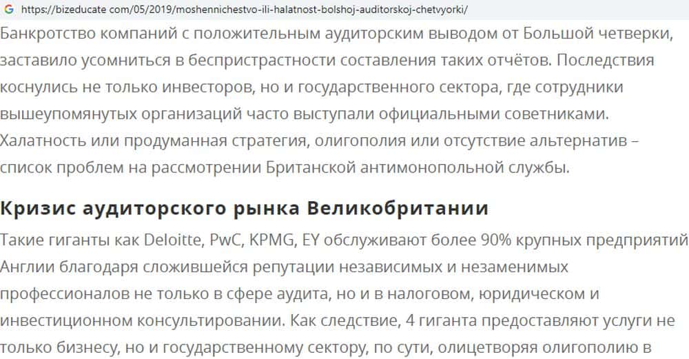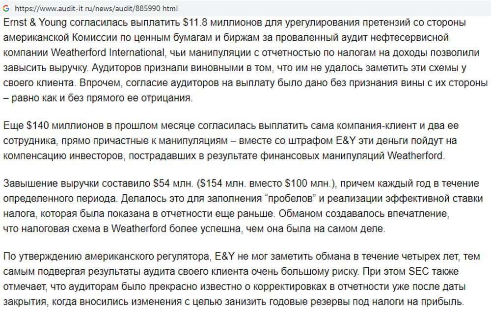 Онлайн-портал bizeducate com подозревает, что отчеты фанерными аудиторами Эрнст энд Янг составляются не беспристрастно. То есть, когда нужно утопить компанию по наводке конкурентов, они найдут нарушения даже там, где их нет. А если финансовым шарлатанам заплатят за лояльное отношение, они "не заметят" и явного мошенничества.