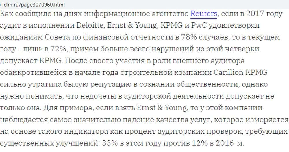 Упоминание о печально известном аудиторе Эрнст энд Янг встречается и на портале icfm ru. Здесь отмечают, что с каждым годом качество услуг транснациональной корпорации падает. Аудит, который должен противодействовать мошенничеству, становится формальностью. Вместо проверок лже-аудиторы собирают дань с лохотронов взамен на свое покровительство.