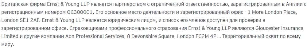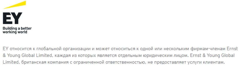 Ernst & Young - аудиторская корпорация, которая участвует в глобальном отмывании денег. Контора входит в так называемую большую четверку; пользуясь деньгами и влиянием, мошенники покрывают теневых брокеров и крупные лохотроны, которые обворовывают сотни тысяч инвесторов, и помогает уводить украденное в оффшоры.