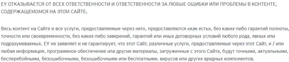 Тут же, парой пунктов ниже, начинаются странности. По словам аферистов Эрнст энд Янг информация на их сайтах подана "как есть", и они за нее ответственности не несут, как и за ссылки и вирусы, которые на этих сайтах могут оказаться. Так что уже просто заходя на ресурс жуликов Эрнст энд Янг, клиенты не защищены от фишинговых компонентов.