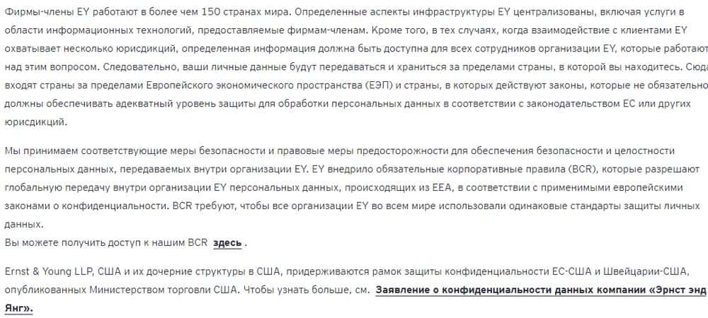 Дальше еще интереснее. Махинаторы Эрнст энд Янг заявлют, что информация может передаваться между фирмами-членами, которые находятся более чем в 150 странах мира... Стоп. Так перед этим они заявляли, что все "дочки" - отдельные юрлица, которые с центральной конторой никак не связаны! А личные данные им передавать почему-то можно.