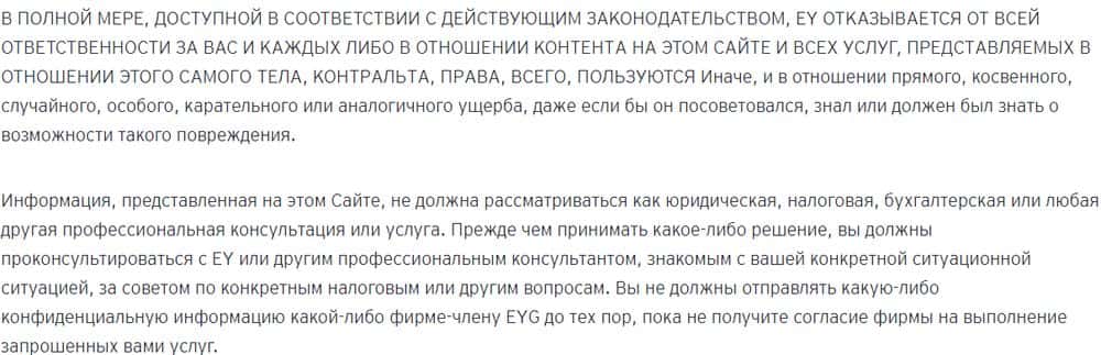 Как такового клиентского соглашения на сайте катал Ernst & Young (ни на одном из них) нет. Из-за сложной структуры из несвязанных друг с другом конторок вообще сложно понять, чем жулики Ernst & Young занимаются: то ли консультациями, то ли аудитом, то ли мошенничеством. Информация на сайте носит информационный характер, так, статьи на злобу дня.