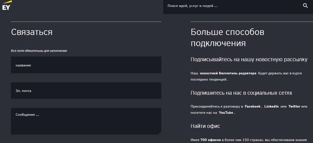 Финансовые злодеи Ernst & Young предлагают ограниченное количество способов связи, как это ни странно. Клиенты могут обращаться через форму обратной связи, почтовых адресов нет, возможности связаться с техподдержкой тоже. Хотя, этот факт перестает удивлять, если вспомнить, что жулики Ernst & Young услуг-то не оказывают никаких.