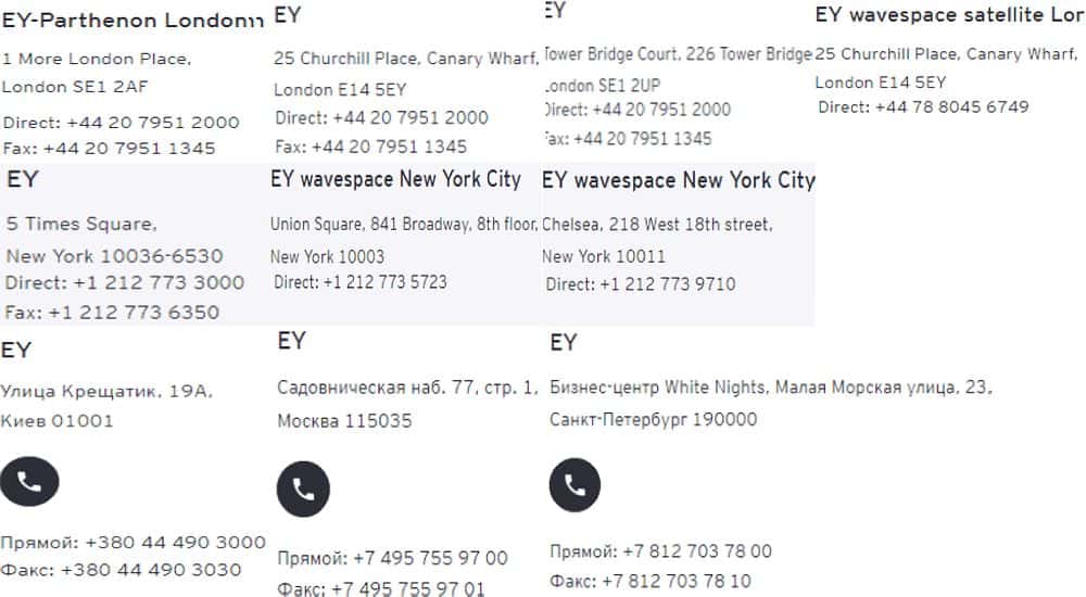У каждой из контор, которая якобы не имеет связи с мошенниками Эрнст энд Янг и действует самостоятельно, свой адрес и телефон (и по-прежнему никаких почтовых адресов). Странно только, что, например, на 5 таких "самостоятельных" филиалов в Лондоне один номер телефона, общий. Вот некоторые из контактов плутов Эрнст энд Янг: