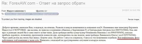 Описанные ранее статистические данные говорят о том, что прецеденты жульничества со стороны ЕСН 24 НЕ исключаются. В итоге, традиционно, в момент когда брокер испаряется, то автоматически, враз, кидают всех клиентов - об этом необходимо не забывать. Как много брокеров на рынке форекс в данное время развели участников рынка, указано выше, это не шутки, все совершенно не по-детски.