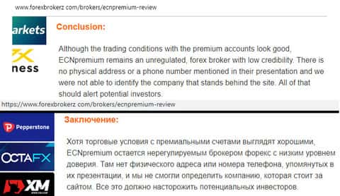 По словам одного интернет-портала, который занимается исследованием подобных форекс-шараг, контора ECN Premium предлагает сотрудничество на таких условиях, чтобы жертва повелась. На самом деле нет ни регуляции, ни точного местоположения офиса и рабочего номера телефона.