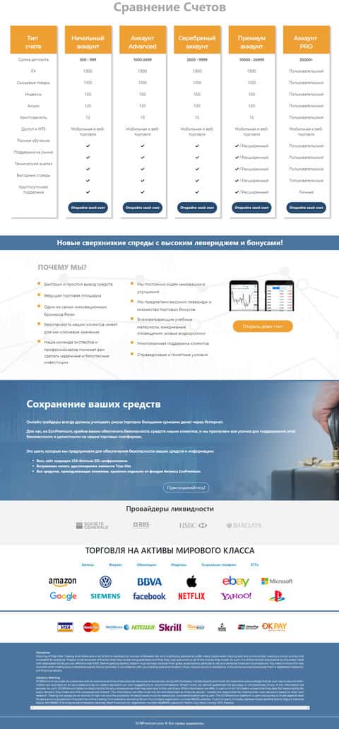 Вторая часть мошеннического ресурса ЕСН Премиум пытается нас привлечь различными типами счетов, которые якобы подстроены под каждого клиента отдельно. Таким образом жулики заранее уже втираются в доверие к жертве и вероятность выманивания суммы денег увеличивается.