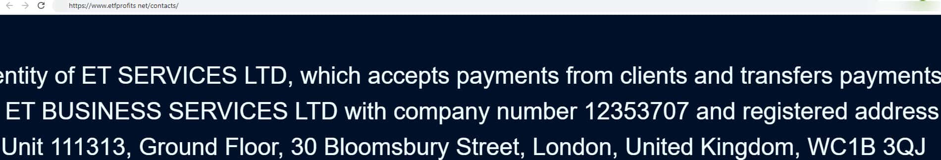 Судя по информации на сайте etfprofits net, компания ET SERVICES LTD также зарегистрирована в Лондоне, а более точный адрес можете посмотреть на скриншоте: