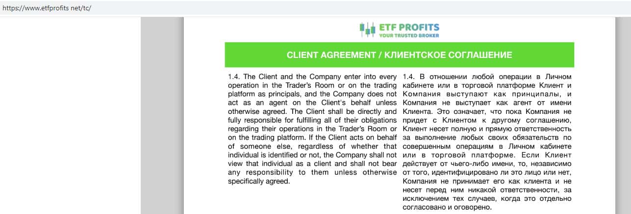 ЕТФ Профитс сразу же в начале соглашения снимает с себя все обязательства и говорит, что клиент сам несёт прямую ответственность за свои действия.