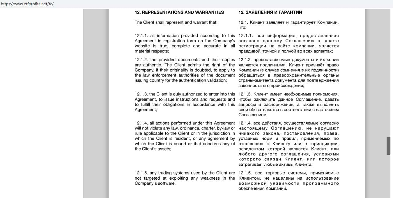 В соглашении на клиента налагаются обязательства, но при этом об обязательствах конторы ЕТФ Профитс ни слова, тем самым открывается путь к беззаконию.