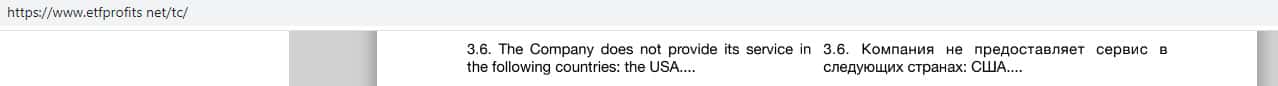 В своём соглашении ЕТФ Профитс написала, что не предоставляет услуги таким странам, как США и оставила незаконченным предложением, тем самым открыт простор для афер.