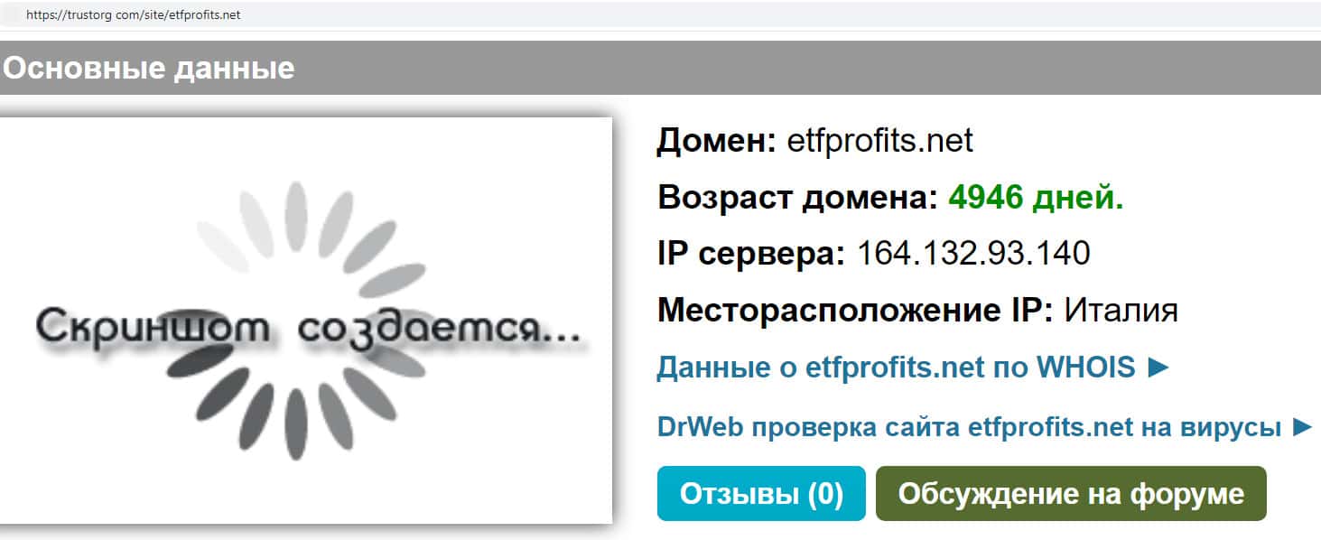 На сервисе trustorg ru анализ сайта etfprofits net показал, что домен был создан 5 тысяч дней назад, а значит эта кухня уже очень много людей обворовала.