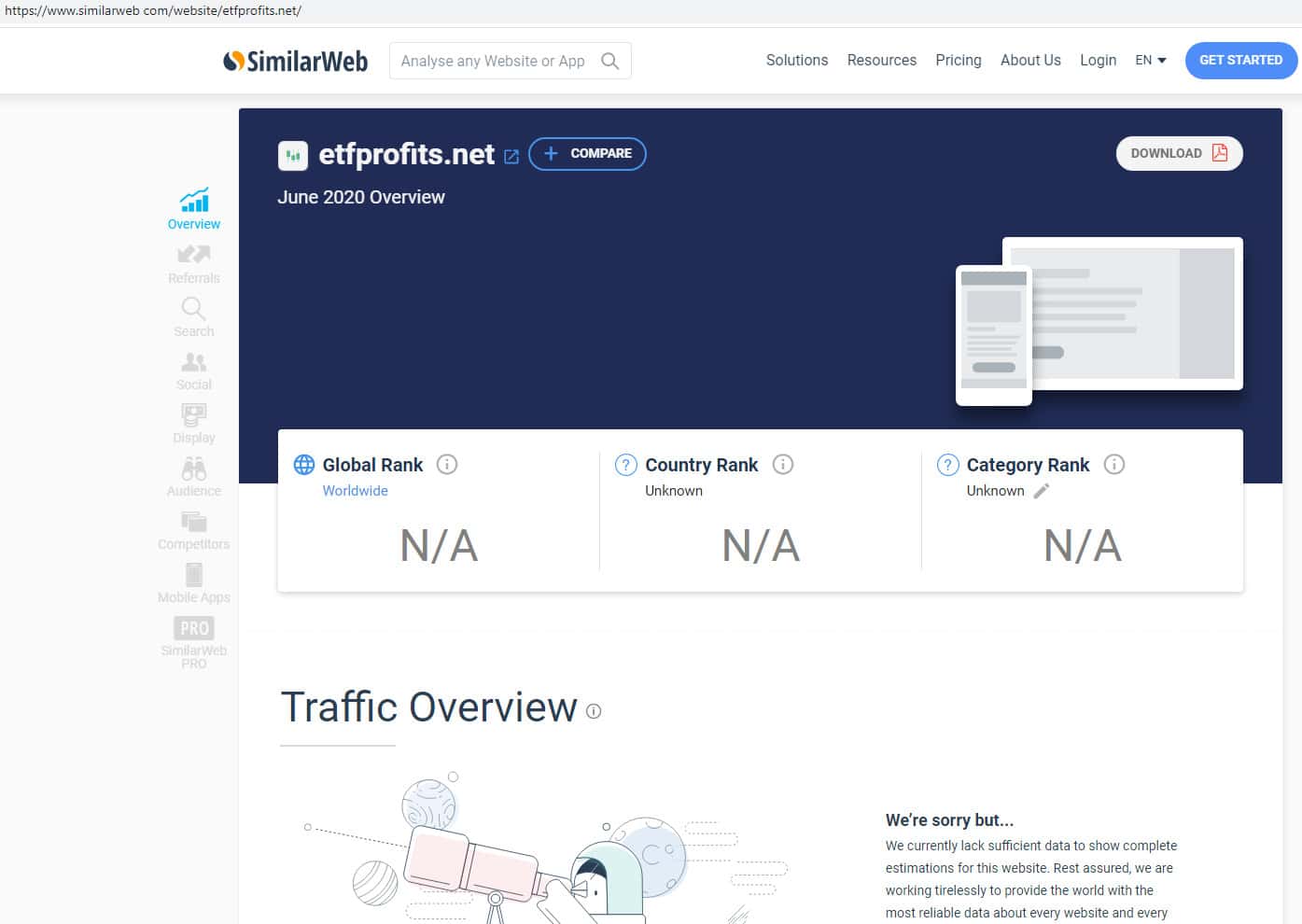 На сервисе similarweb com при попытке анализа входящего трафика сайта etfprofits net, результаты оказались закрыты, так как сайт является обычным лохотроном.