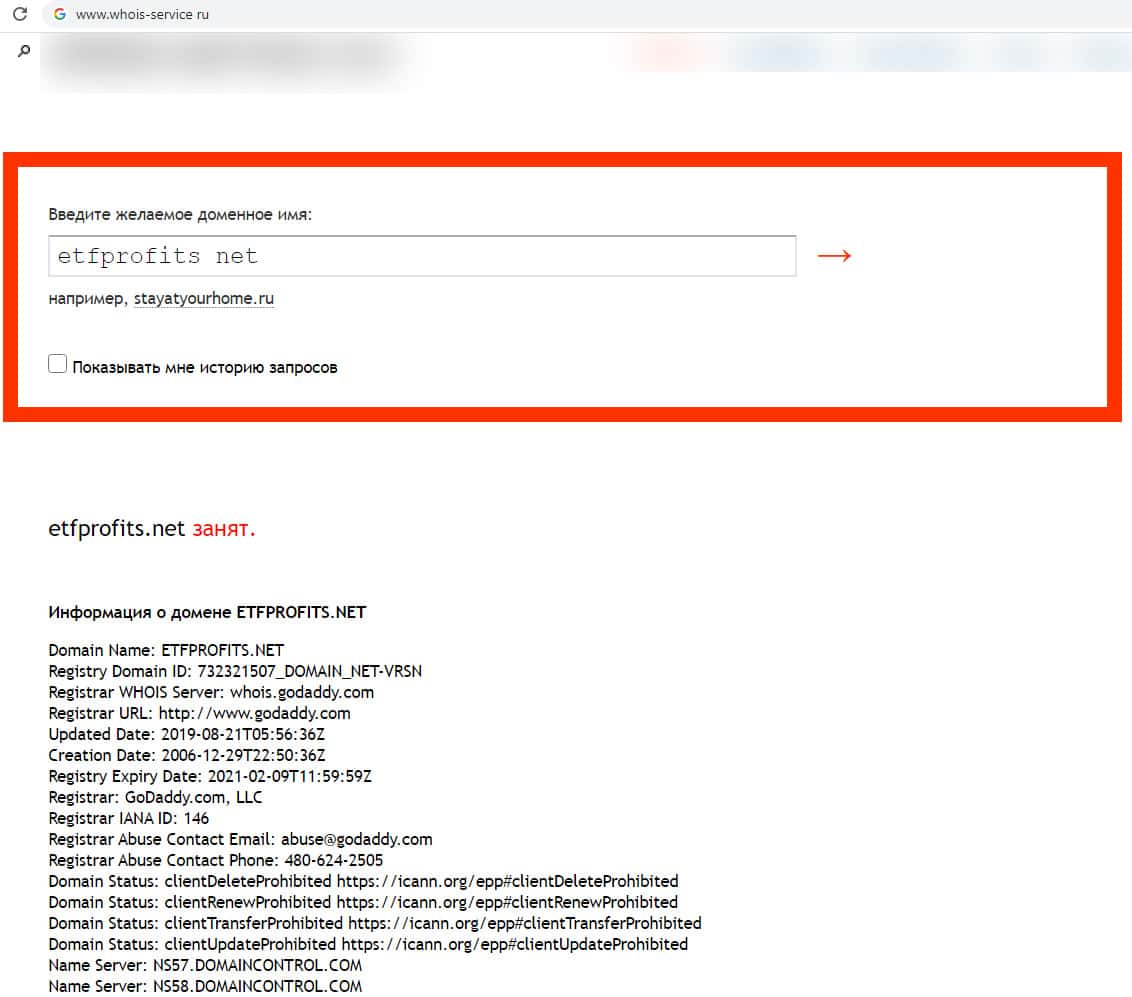 Был проведён анализ сайта etfprofits net на сервисе whois-service, в котором не содержалось никакой информации о владельце домена мошеннического брокера.