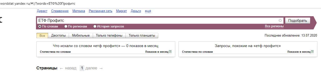 А запрос "ЕТФПрофитс" тоже не набрал ни одного посещения, поэтому можно утверждать, что в русском сегменте эта мошенническая кухня не популярна.