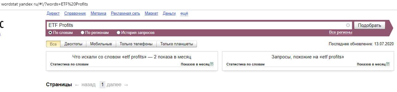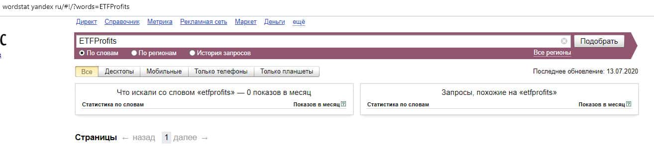 Ещё один русскоязычный запрос "ЕТФПрофитс" тоже не собрал никакой активности и статистика по ней просто-напросто отсутствует.