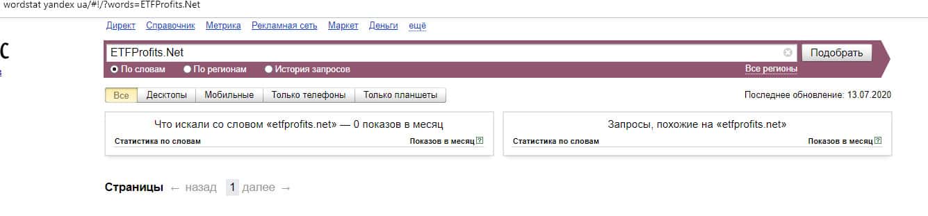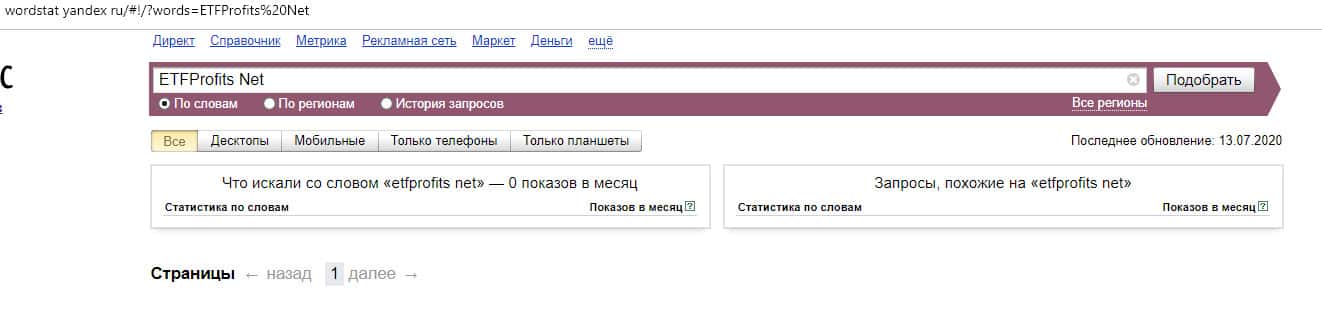 Запрос по доменному имени "ETFProfits Net" тоже совсем не набирает показов, что очень сильно влияет на представление о брокере ЕТФ Профитс.