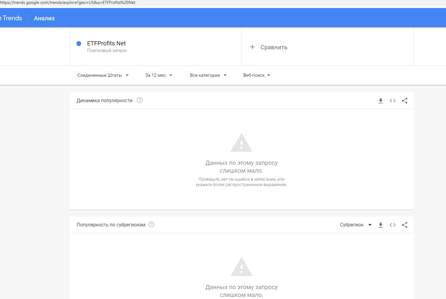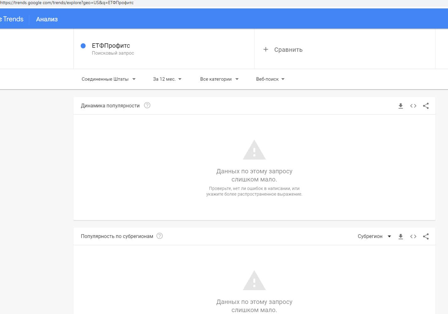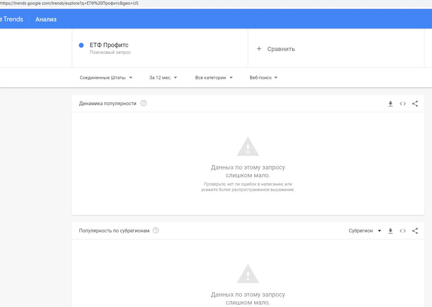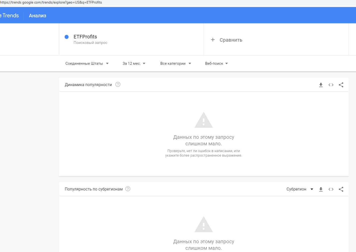 А вот запрос "ETF Profits" тоже почему-то не собрал нужного количества показов, чтобы Гугл Трендс показала статистику об этом.