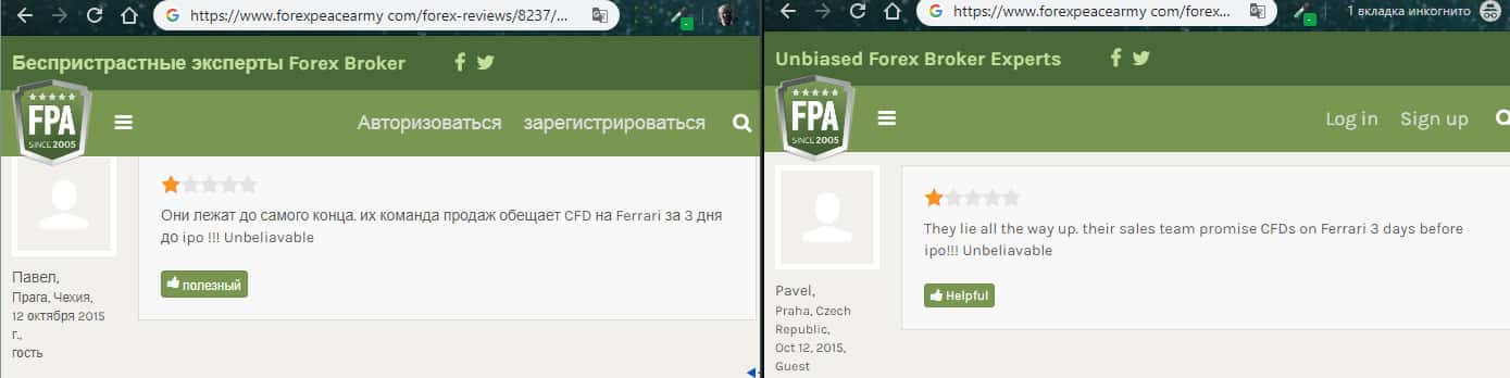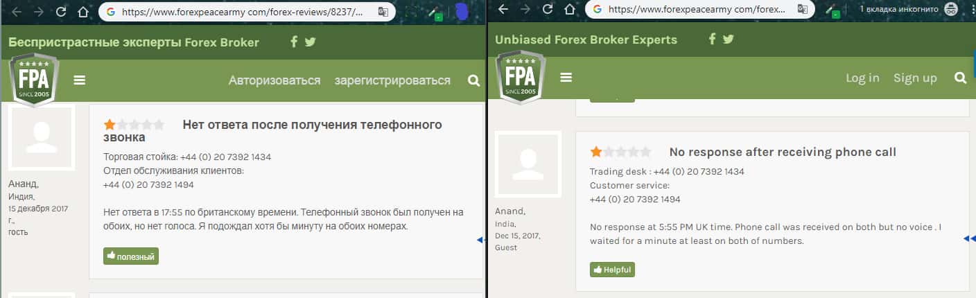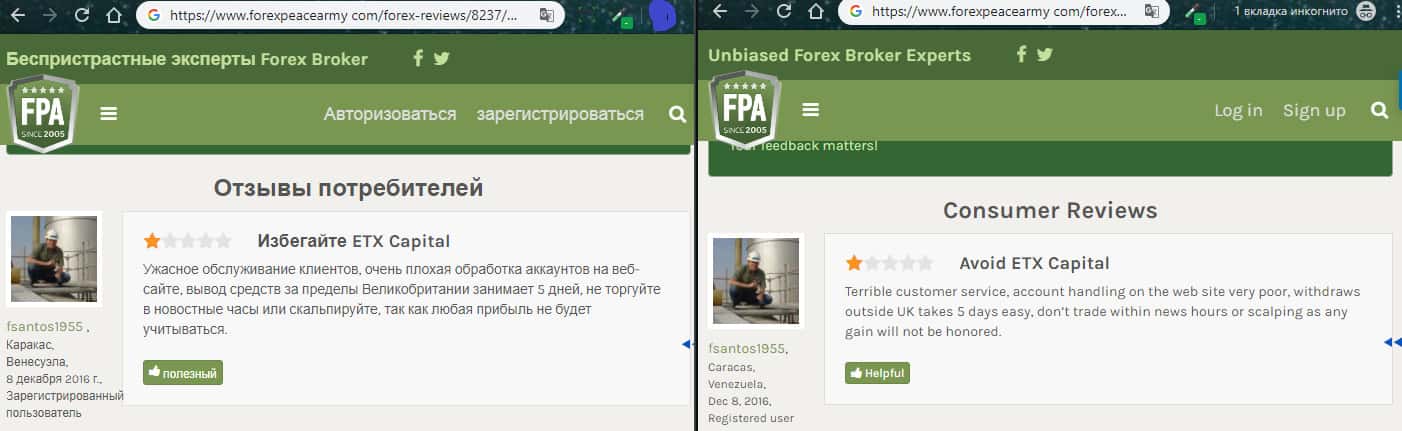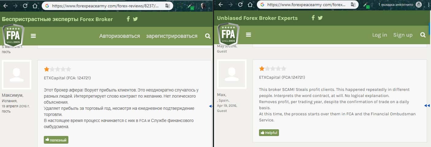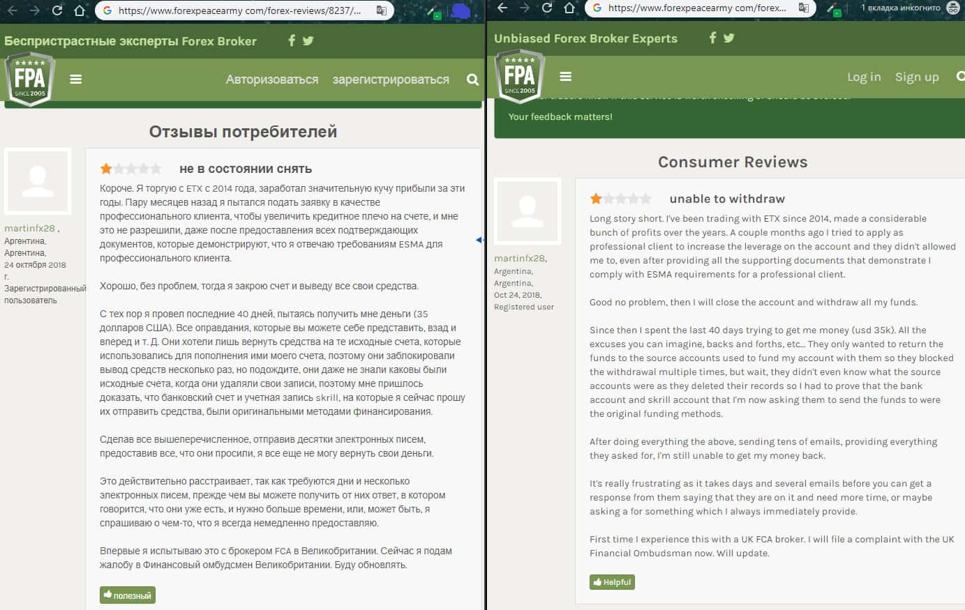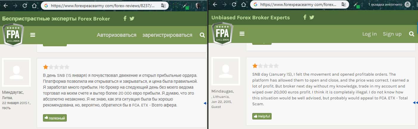 На изображении, расположенном ниже, вы можете наглядно увидеть очередной негативный отзыв об аферистах ETX Capital с портала forexpeacearmy com, который связан с тем, что мошенники ЕТХ Капитал снова опрокинули очередного наивного пользователя сети интернет под довольно стандартным и типичным предлогом торговли форекс, по итогу которой шулера ETX Capital обещали золотые горы.