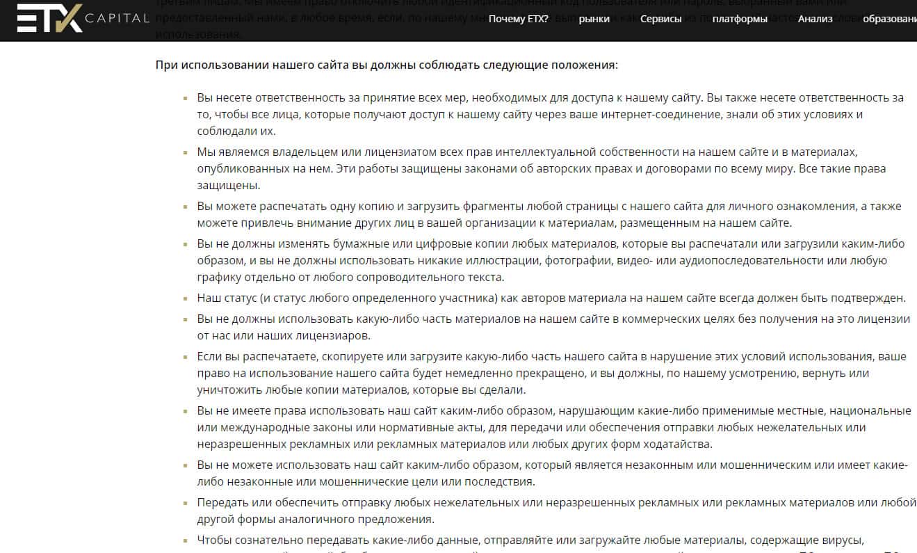 Условия сотрудничества у лохотрона ЕТХ Капитал начинаются с вполне стандартной "воды" о том, что это за документ и зачем он нужен, в ходе которой аферисты ETX Capital так же говорят о том, что пользователи фактом использования сайта соглашаются с данными условиями. На изображении, расположенном ниже, вы можете увидеть начало условий сотрудничества шулеров ЕТХ Капитал.