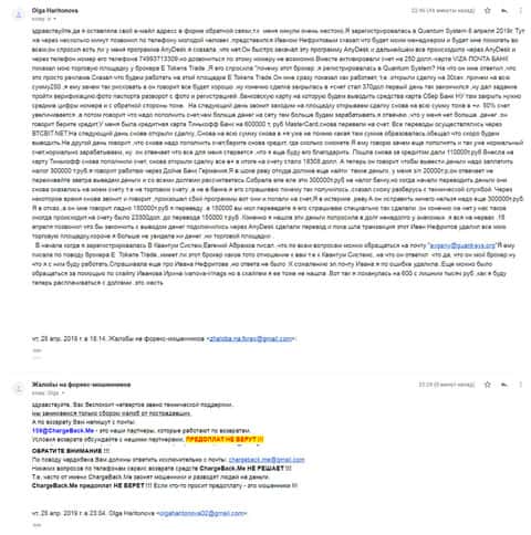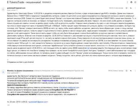 Женщина, которая написала нам письмо с жалобой, прекрасно понимает, что попалась на удочку к шулерам Е-Токенс Трейд через сайт Quantum System и в данном случае есть только один выход, который предложила ей подруга - написать подробное заявление в организацию ChargeBack.Me которая постарается помочь.