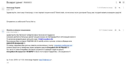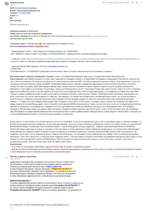 Одна женщина рассказала историю в которой она вляпалась в кухню Е-Токенс Трейд. Аферисты запудрили ей мозги и она оставила там свыше 12 000 рублей. Чтобы решить вопрос с выводом, клиентке пришлось написать все подробности в организацию ChargeBack.Me где работают профессионалы.