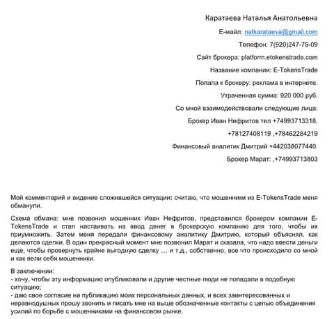 Детальная жалоба на ЕтокенсТрейд - клиент утратил 920 000 рублей