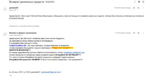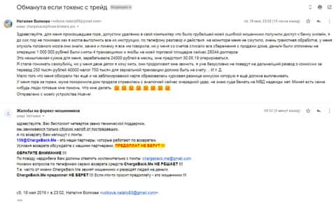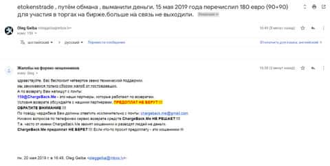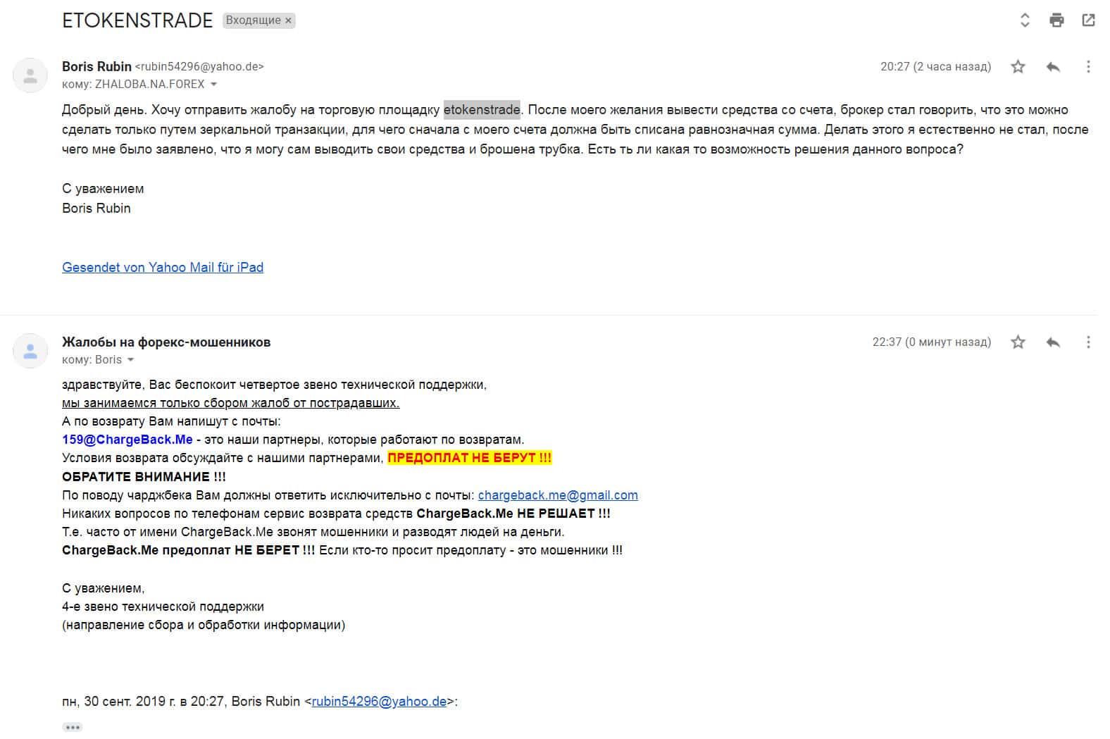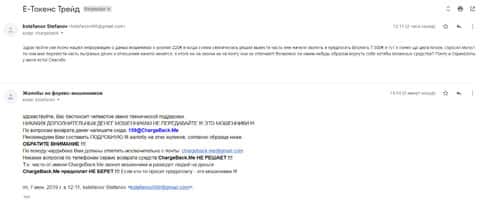 На почтовый адрес веб-площадки по сбору информации о форекс-аферистах пришла очередная жалоба на мошенников в лице конторы ЕТокенсТрейд. По поводу возврата утраченных денежных средств автору письма посоветовали как и остальным обманутым клиентам сей конторы, обратится в сервис ChargeBack.Me