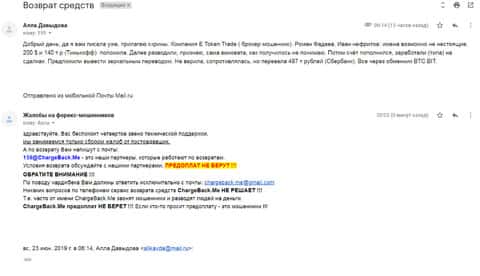 Женщина отправила письмо в подробностях в организацию ChargeBack.Me чтобы довести что лохотрон E-Tokens Trade обворовал ее. Контора втерлась в доверие к будущей жертве и под предлогом пробной инвестиции она вложила деньги. Аферисты обещали, что можно будет вывести деньги в любое время, но вместо этого требуют еще вложить.