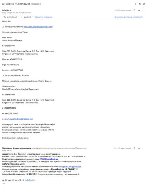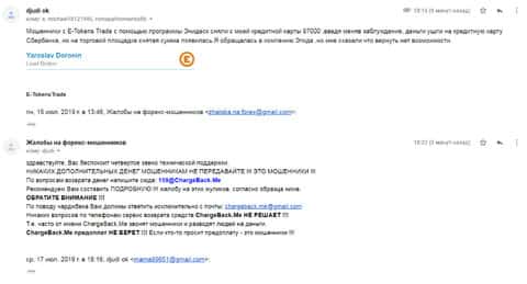 Письмо пришло от человека который связался с лохотроном Е-Токенс Трейд и вложил туда порядка 200 евро. Когда он решил вывести деньги, мошенники перестали выходить на связь. Благо что в интернете есть такая организация как ChargeBack.Me которая попробует помочь вывести любую сумму из лап шулеров.