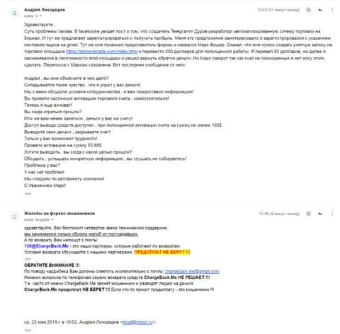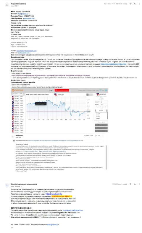 В следующем письме, опрокинутый клиент лохотроном Е-Токенс Трейд, в подробностях изложил все схемы развода, на которые он попал. Жулики использовали торгового робота и таким образом им удалось слить почти 1000 долларов. Вся надежда на возврат средств теперь лежит на службе ChargeBack.Me в которую он недавно обратился.