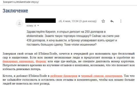 - Подробная жалоба на аферистов Э-Токенс Трейд - клиент утратил несколько сотен долларов