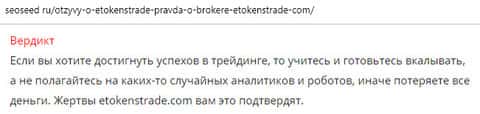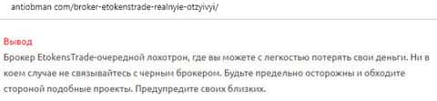 Один из интернет-порталов, который занимается анализом проектов-лохотроном, высказался по поводу конторы Е-Токенс Трейд. Ресурс уверяет, что если вы хотите заработать денег, то ни в коем случае не работайте с E-Tokens Trade, иначе станете такой же жертвой обмана, как и уже множество их клиентов.