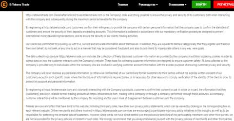 Что касается документа под названием "Политика конфиденциальности", так здесь есть много лазеек, с помощью которых контора Е-Токенс Трейд может вывести ваши личные данные во внешнюю среду. Поэтому, передав на верификацию все свои документы, вам не будет гарантирована безопасность личных данных.