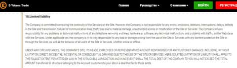 Также об ограничения ответственности жулики E-Tokens Trade упомянули в своем договоре, который имеет также много лазеек для ухода от ответственности. Клиент, подписав данный договор подставляет себя под угрозу лишения всех своих средств. При чем контора ни за что отвечать не будет.