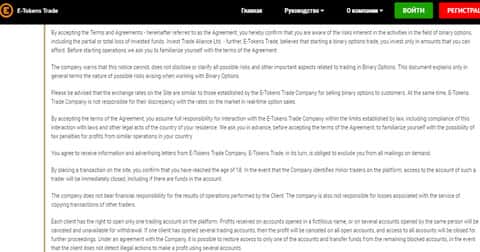 Форекс-кухня E-Tokens Trade не удосужилась получить лицензию от регулирующих органов и все-таки выкрутилась из положения. Вместо лицензии, у себя на сайте, аферисты создали раздел Отказ от ответственности, в котором они освобождают себя от ответственности за определенные свои действия, в том числе и слив депозита.