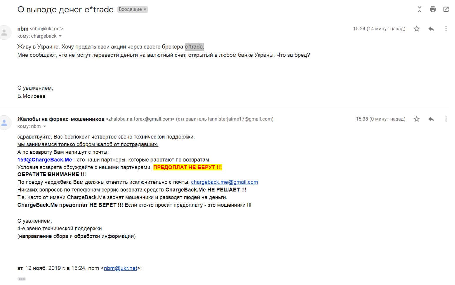 - Клиент шарашки E-trade предупреждает остальных – не связывайтесь с данными разводилами