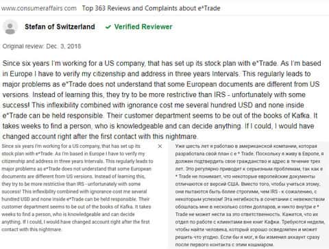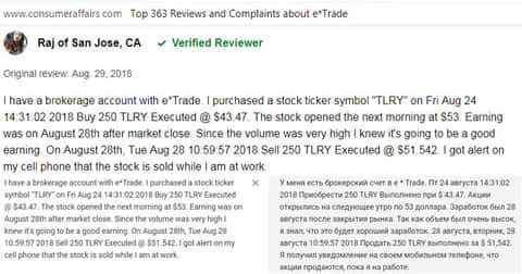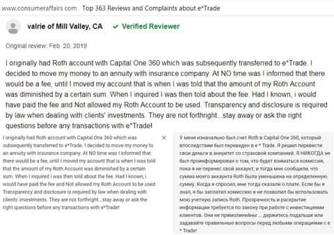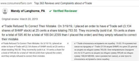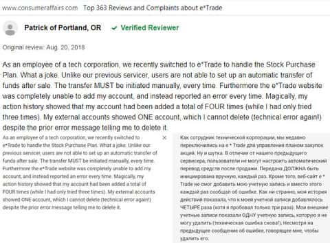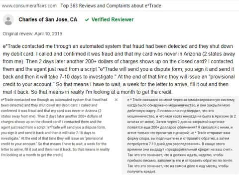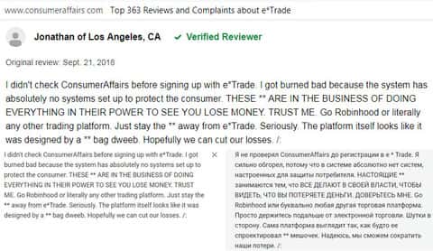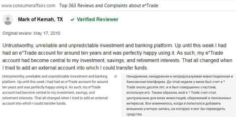 За помощь. мы обратились к уважаемому американскому веб-сайту consumeraffairs com, на котором располагаются отзывы реальных пользователей о сотрудничестве с той или иной компанией. Каково было наше удивление, когда якобы надёжная контора E-trade на поверку оказалась обычной разрекламированной шляпой с кучей изъянов и подстав для клиента.