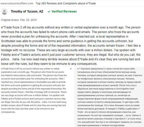 Хоть в основном веб-сайт E-trade и рассчитан на американцев, люди по нашу сторону глобуса также возмущаются о том, что жулики Е трейд как и отечественные брокеры-мошенники не дают клиентам вывести свои средства. И если вы думаете, что такая судьба проходит западных пользователей стороной, то отзывы американцев далее призваны вас переубедить.